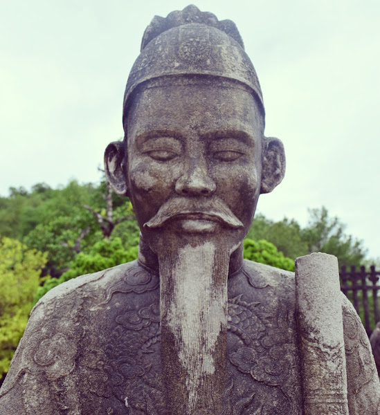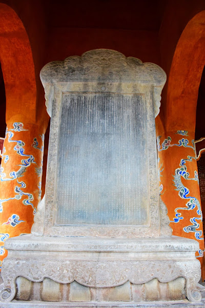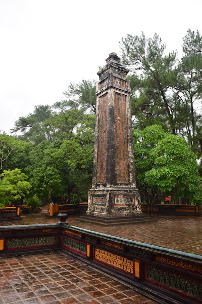 Si la vida de Khai Dinh fue peculiar, la de Tu Duc no lo fue menos, y él mismo tuvo tiempo aún de reflexionar sobre ella y grabar sus errores en esta enorme estela de veinte toneladas de peso que tardó cuatro años en llegar desde las canteras del lejano norte, exactamente a 500 kms de la tumba.
