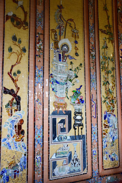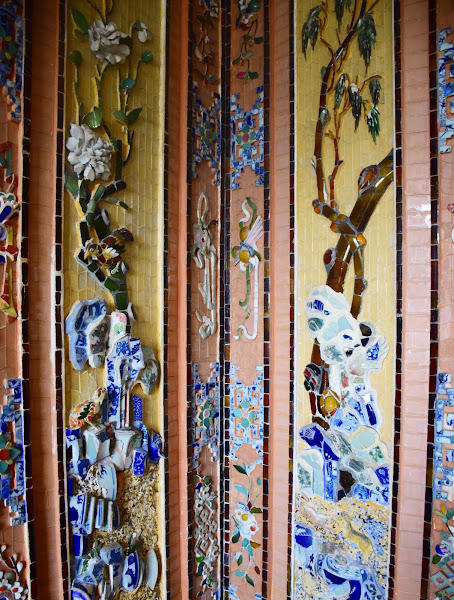 Las paredes y techos están recubiertos en su totalidad con murales hechos no de oro y mármoles jaspeados, sino trozos de porcelana, terracota y cristal, que nos recuerdan al trencadís gaudiano. Debió ser un poco triste, ver como las paredes lisas de las salas laterales debían ser pintadas como un trampantojo para imitar las vetas del mármol más fino.