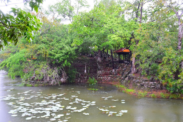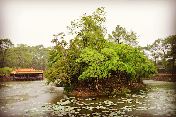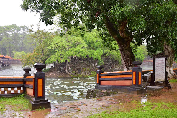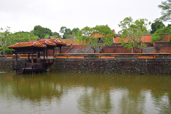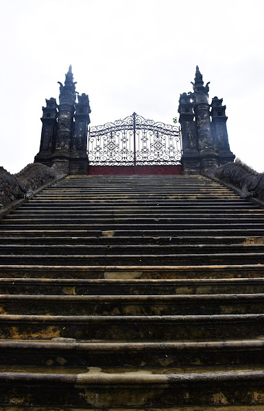 Lo primero que vemos tras dejar la carretera y entrar al terreno donde se asienta el mausoleo, es una escalera que nos lleva a un muelle desde donde el emperador embarcaba para llegar a la islita de Tinh Khiem, para cazar pequeñas aves.