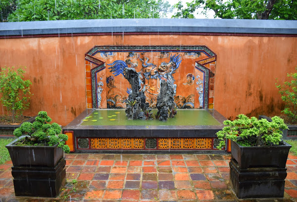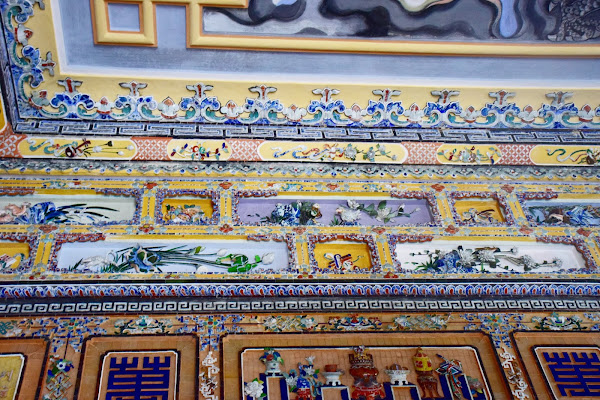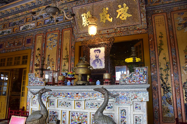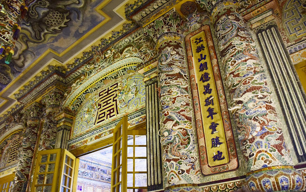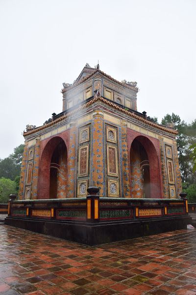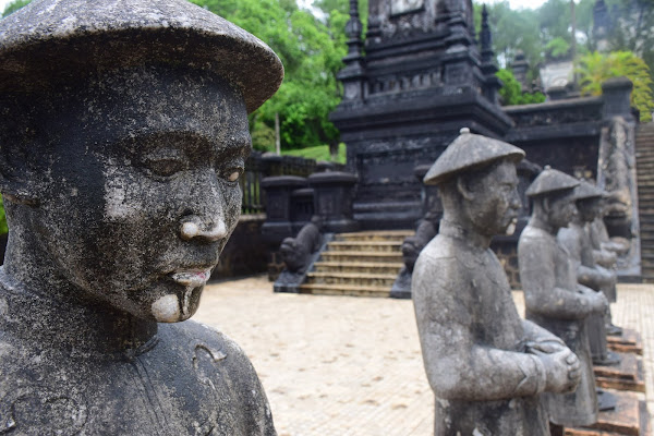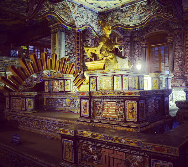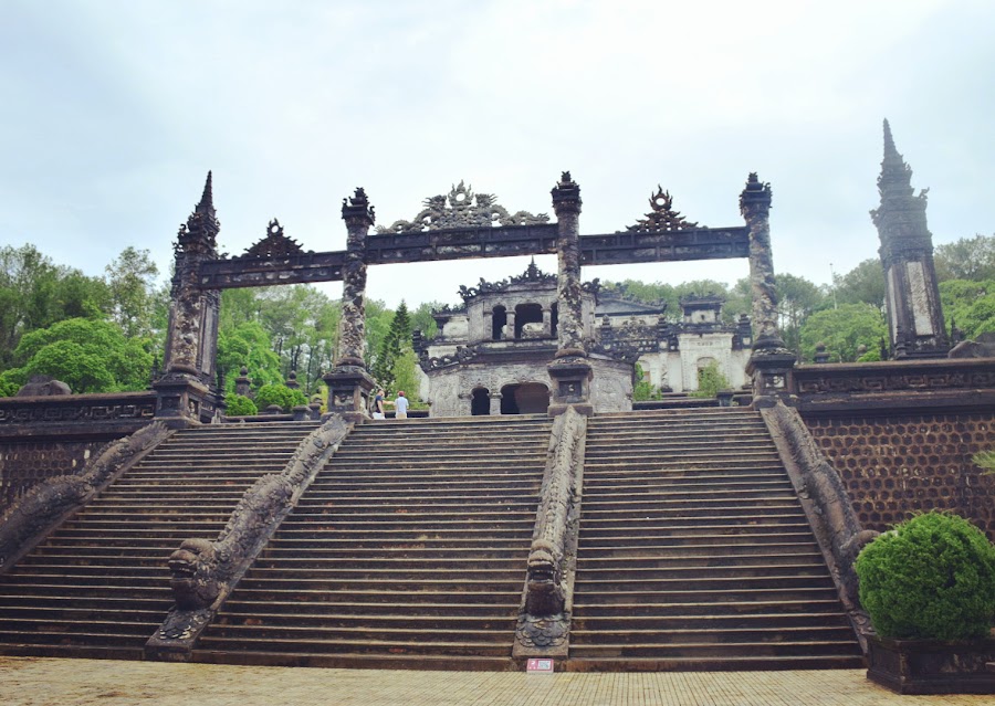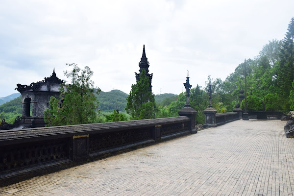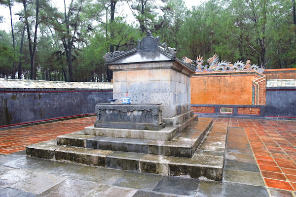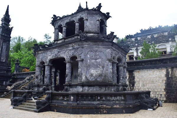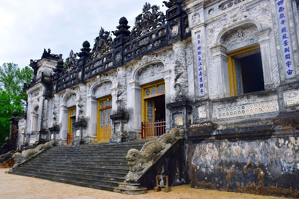 El emperador, tristemente se tuvo que conformar con levantar su tumba en humilde cemento, ya que su reino era tan pobre y estaba tan esquilmado que no era posible gastarse las rentas en mármol, tal y como había visto en Francia. Así que tuvo que echar mano de toda su imaginación y la de sus constructores para darle a su sepultura esos aires que mezclan lo europeo y lo vietnamita en una síntesis que no deja indiferente al visitante.