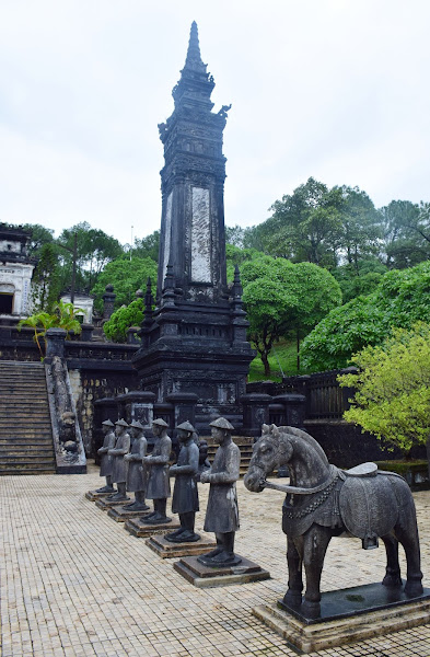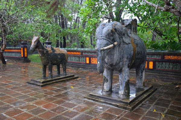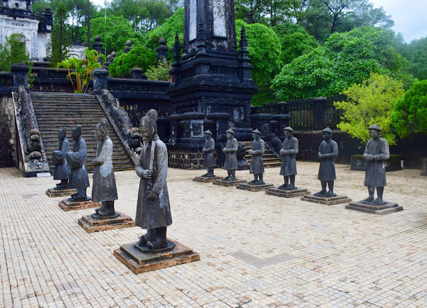 Tras subir unas pequeñas escalinatas accedemos al Patio de Honor, donde nos esperan en perfecta formación un pequeño ejército de elefantes, caballos y mandarines. Estos últimos fueron tallados en un tamaño más pequeño que el emperador, algo curioso, si tenemos en cuenta que Tu Duc tan sólo medía 1,53 m.
