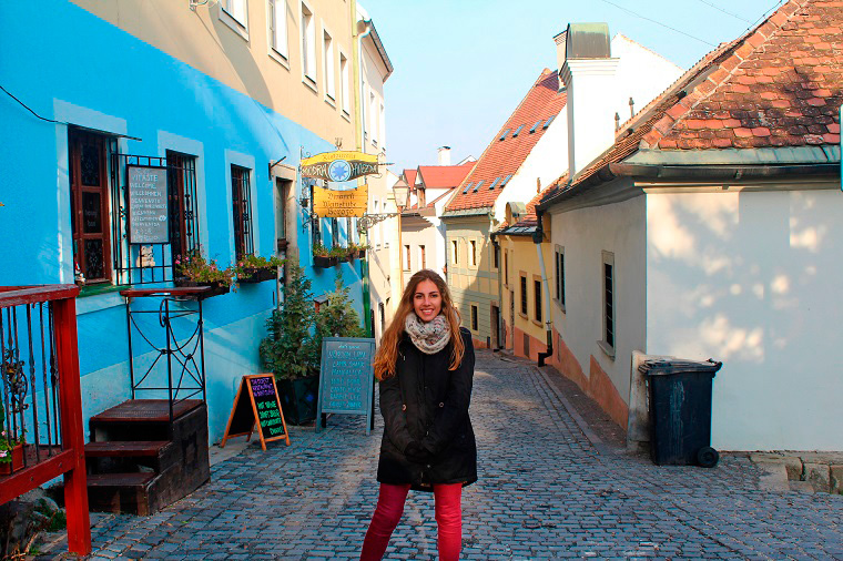 Era una especie de Albaicín de Granada al estilo centroeuropeo. Callecitas estrechas y empinadas encantadoras sin perder el encanto del casco antiguo de Bratislava y con gente mucho más seca. Después había unas vistas espectaculares al río y al puente hasta que finalmente llegamos al castillo, pero nos encontramos con que no se podía acceder ni siquiera a los jardines, así que optamos por quedarnos por los alrededores, sentarnos en un banco al sol y descansar un rato, pero no sabéis lo que era eso y nosotros tampoco. El sol no servía para nada, sentarse en el banco era como sentarse en un pedazo de hielo y quedarse inmóvil 2 segundos era condenarse a la congelación, por lo que no podíamos pararnos mas que para hacer algunas fotos. Fue horrible.