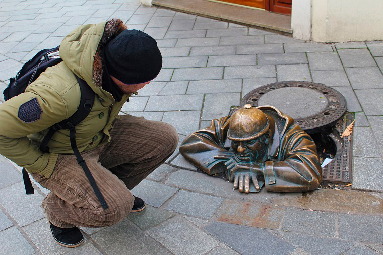 Bratislava es conocida también por sus esculturas escondidas por los callejones del casco antiguo, aunque tal vez nos faltó callejear un poco más porque solamente nos topamos con una, pero al menos es la más conocida: Cumil, el trabajador bonachón que asoma por la alcantarilla.