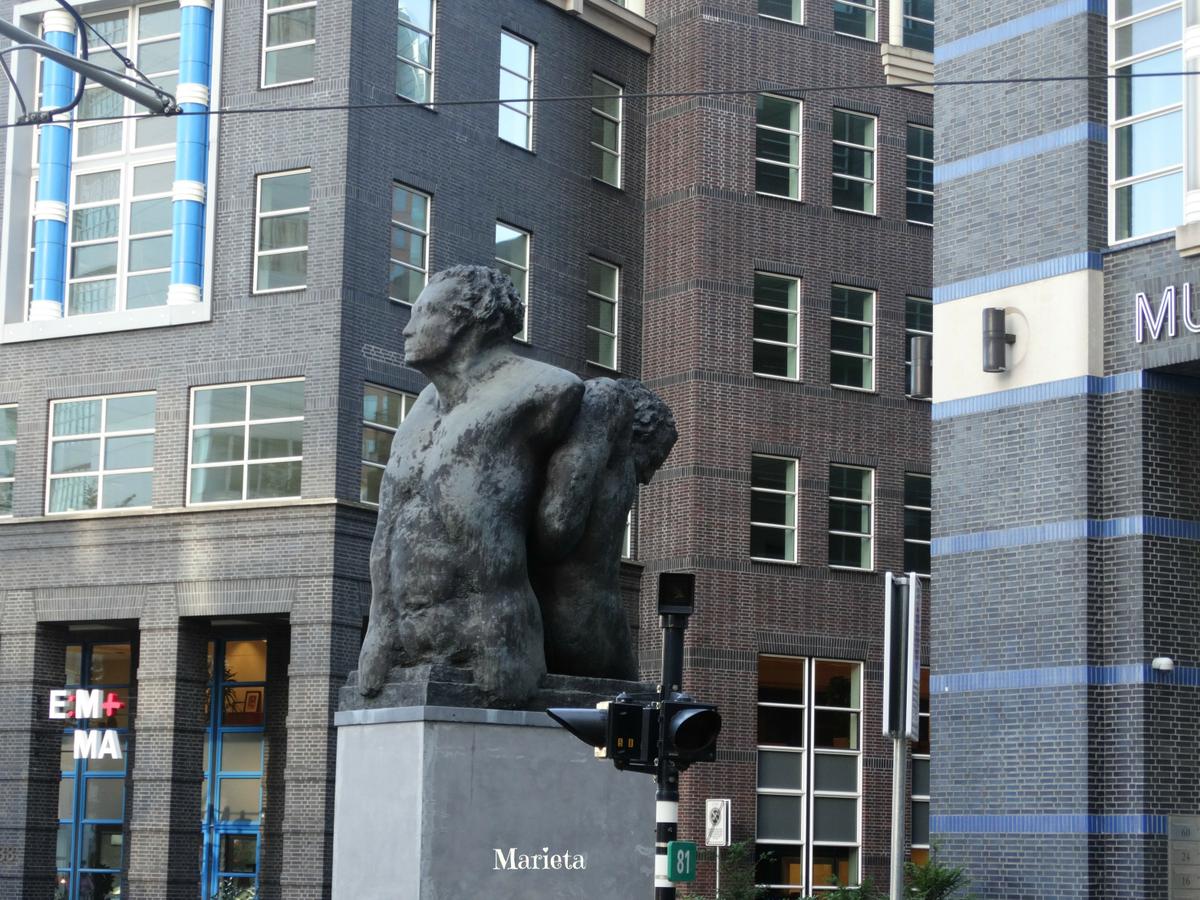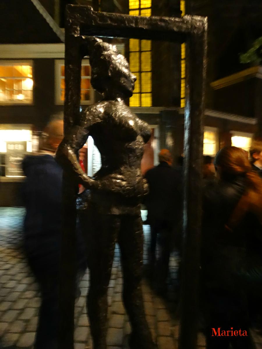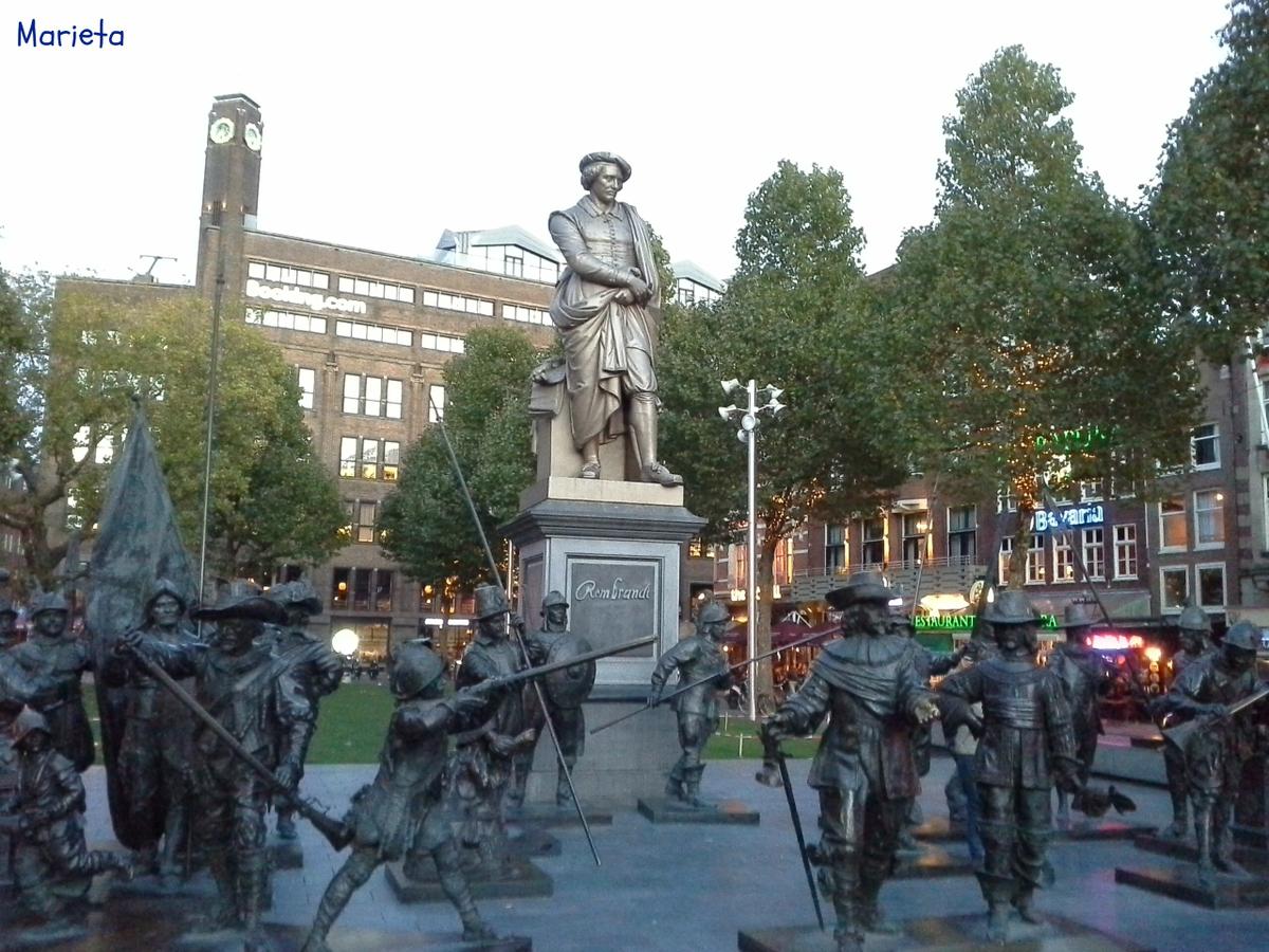 Antes de cenar y dar por terminada nuestra estancia en Amsterdam, nos acercamos a la Plaza de Rembrandt. Este lugar se conocía en el siglo XVII como el Botermarkt (mercado de la manteca) porque todos los lunes se compraban en él los productos lácteos frescos de las granjas de los alrededores de la ciudad. En 1852 se colocó en el centro de la plaza una estatua en recuerdo de Rembrandt que pasó a llevar el nombre del pintor. En 2006, con motivo del 400 aniversario del nacimiento del artista, el escultor ruso Mijail Dronov realizó una serie de 22 esculturas de bronce que reproducen los personajes del cuadro “Ronda de noche”.