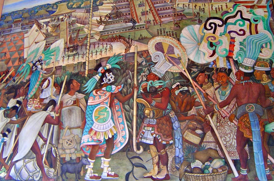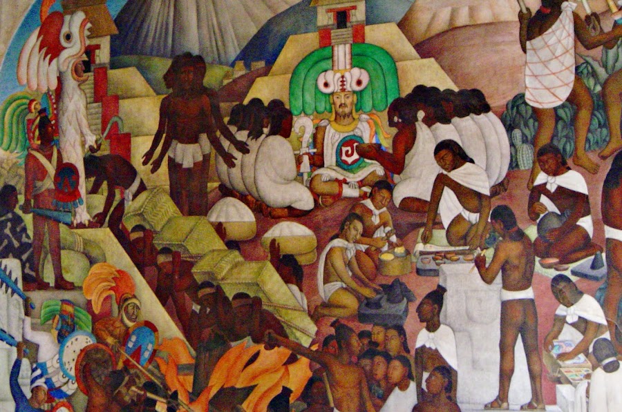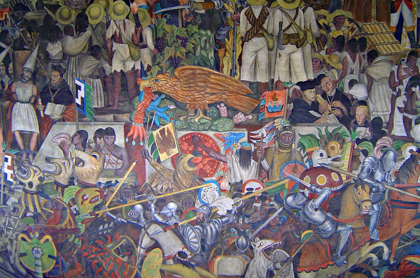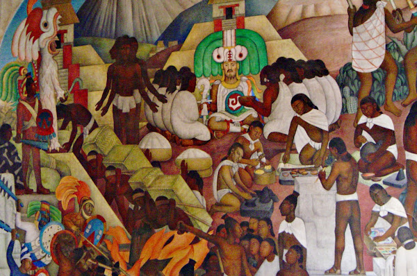 En el mural aparecen políticos como Porfirio y Madero, la Malinche, la Inquisición, Zapata tras su cartel de Tierra y Libertad, Juarez, Hidalgo y Cuauhtemoc, entre otros. Esto sería el mural central. A los lados tendríamos los murales de lo Aztecas y Tlaxcaltecas, los tarascos y sobre todo el mural de Tenochtitlan, el que más suele impresiona por la recreación de como era la capital azteca.