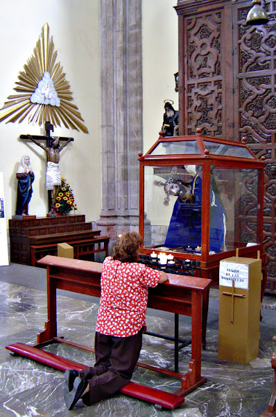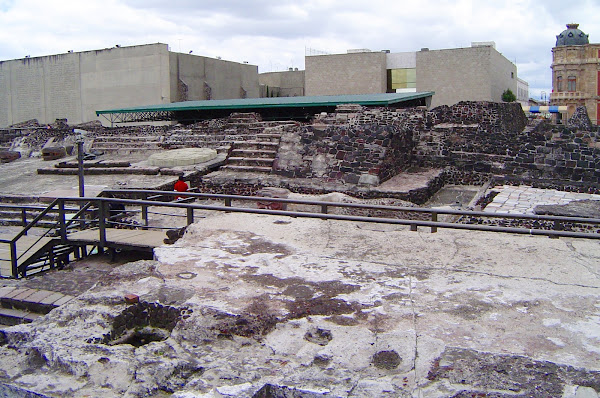 Es impresionante pararse enfrente de ella y pensar que bajo ella, estuvo el lago Texcoco y a su alrededor las grandes construcciones aztecas, como el Gran Templo que está a su lado. Si os fijáis, el péndulo de la foto indica el grado de inclinación, cada vez más pronunciado de inclinación del suelo, ya que los cimientos se hunden en el suelo arcilloso del antiguo lago....