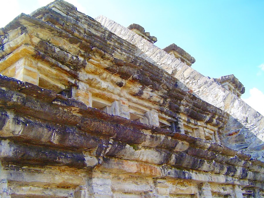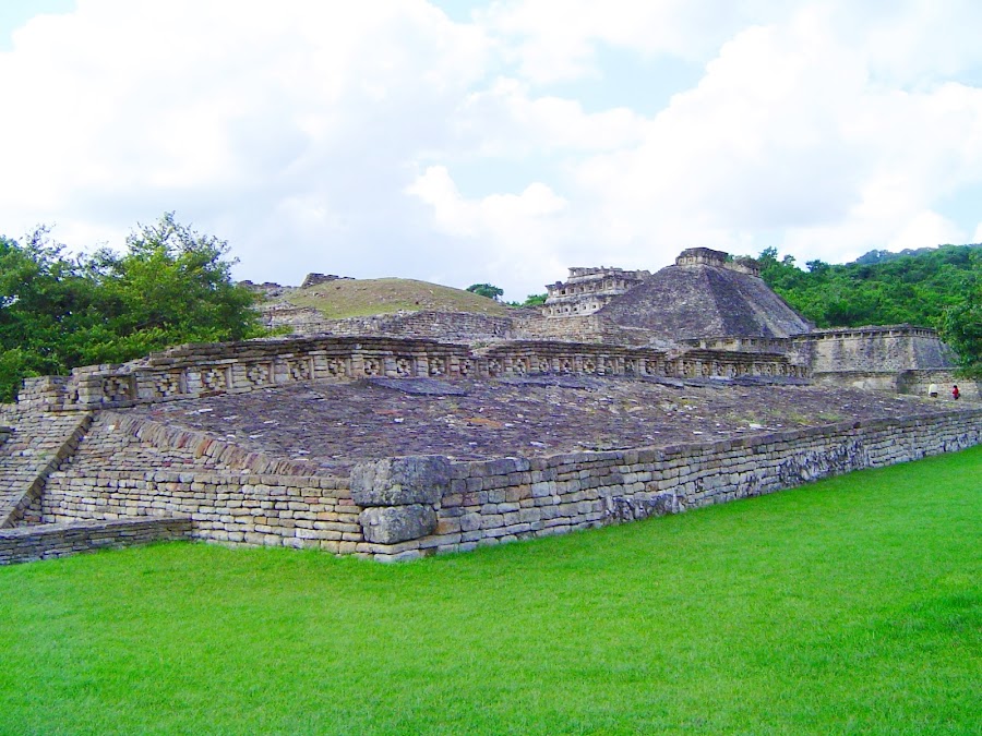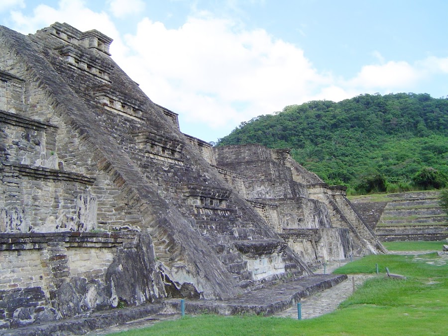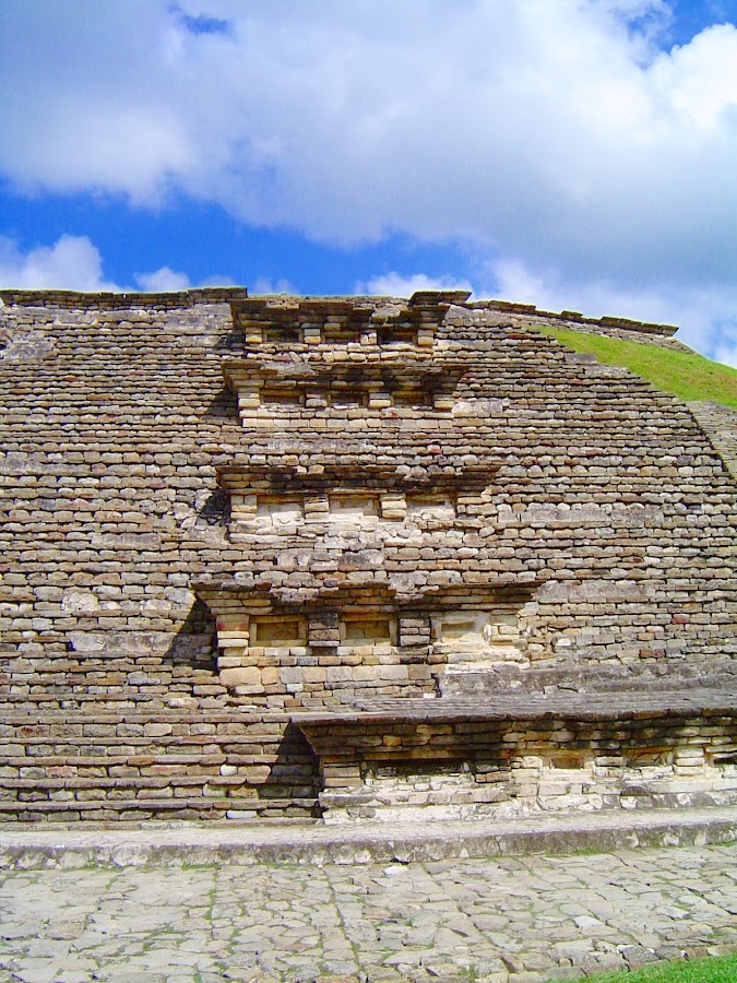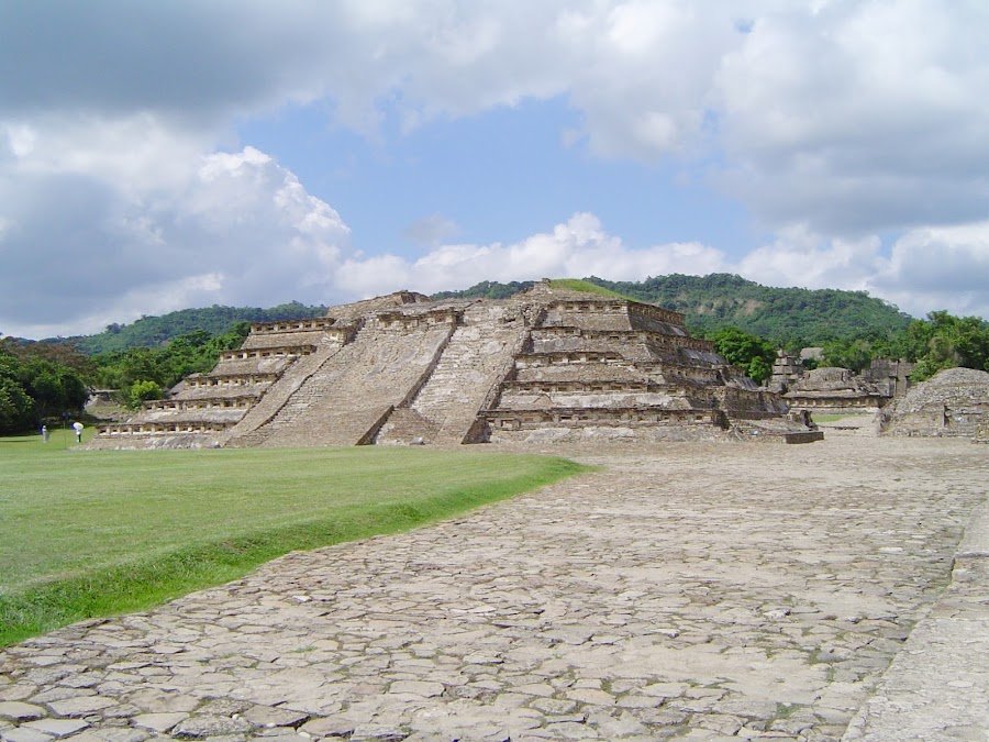 Nos cuenta que la mayoría de los edificios fueron edificados entre los años 900 y 1150 y convirtieron la ciudad en un centro político y religioso de primer orden dentro de la civilización totonaca. Nos acerca a ellos y nos demuestra que aunque de lejos parecen hechos de pura piedra, gris y fría, una segunda mirada nos enseña parte de su colorido primitivo, unos azules, rojos y negros.