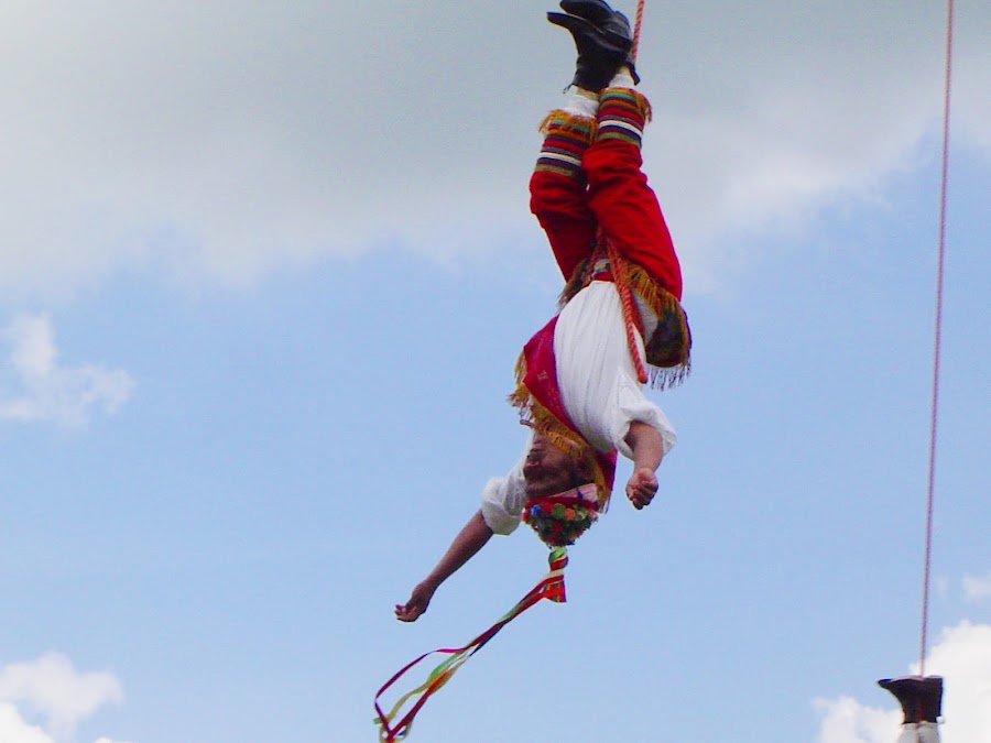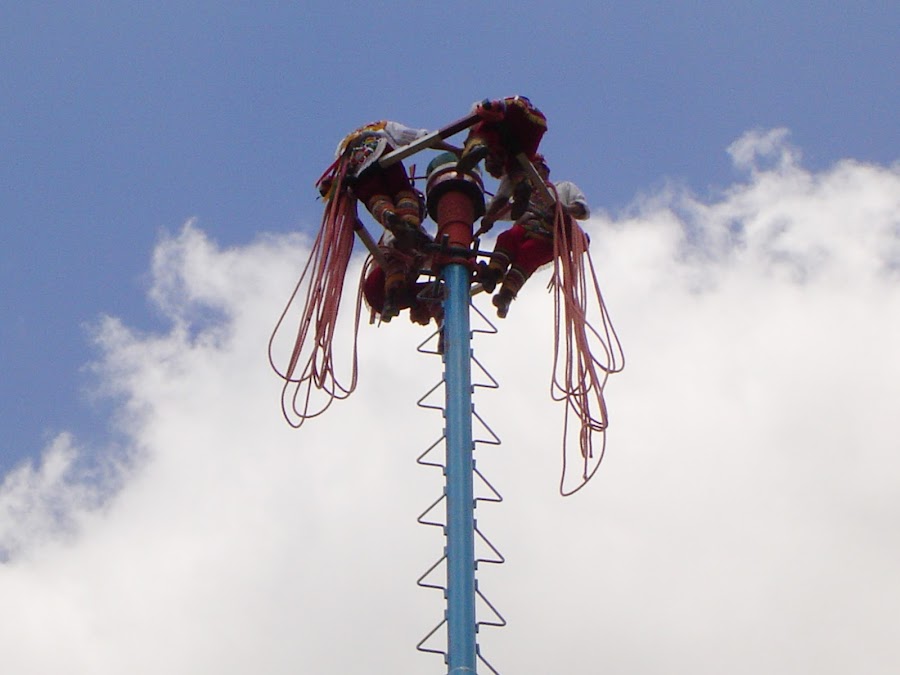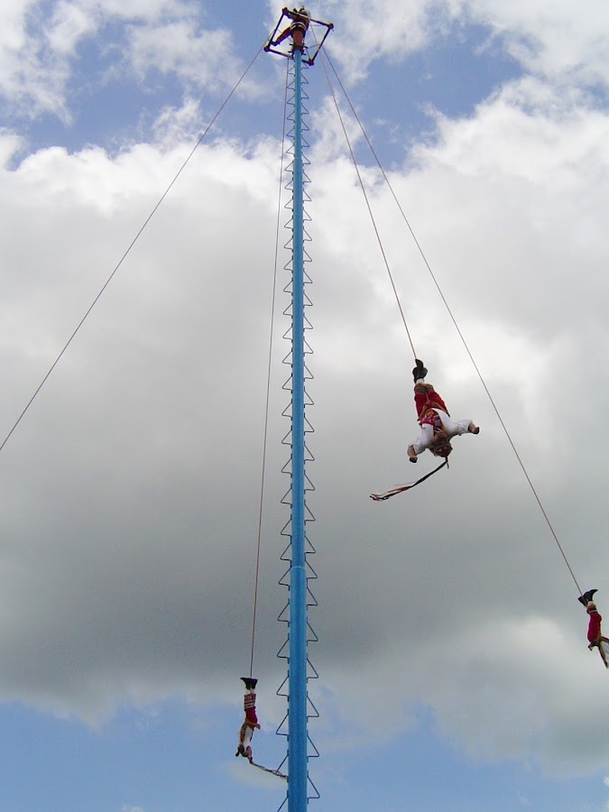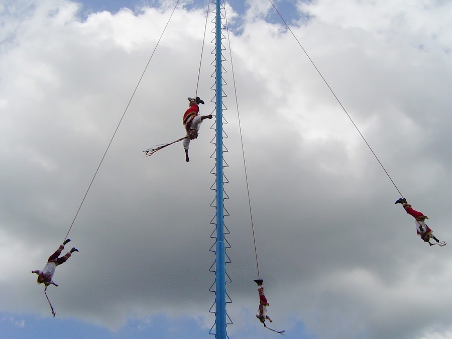 Justo en la entrada al Parque Arqueológico de Tajín aparece un poste. De repente, al congregarse varios grupos de visitantes, aparecen cinco hombres vestidos de rojo y blanco, con unos delantales de terciopelo bordados y unos sombreros en forma de capirote, forrados de flores y espejos. Uno de ellos lleva un tambor y una flauta que hace sonar, cada uno con una mano. Giran alrededor de la base del poste y de repente todos, menos el músico empiezan a subir por el poste. Luego el músico hace lo mismo mientras los demás ocupan su sitio, en cada punto cardinal y se atan las piernas.