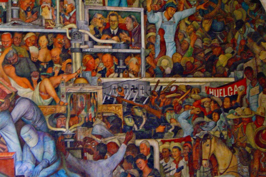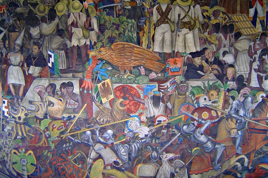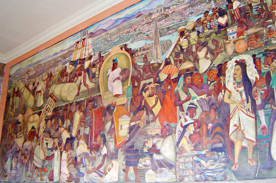 Pero lo que realmente destaca se encuentra dentro, los murales que Diego Rivera pintó entre 1929 y 1935 al calor de la Revolución. Si nos detenemos delante de cada uno de ellos, por ejemplo delante de " La Historia de México", vemos una visión partidista, entendida como la lucha entre los buenos ( pueblos precolombinos, caudillos independentistas y revolucionarios) y malos ( colonialistas, conservadores y capitalistas).