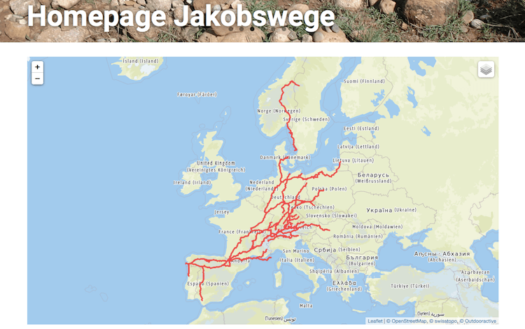 Sí, está en alemán, pero me encanta este nodo internacional de Caminos por su detalle en comunicar la internacionalidad del Camino de Europa mediante mapas y “tracks” descargables.