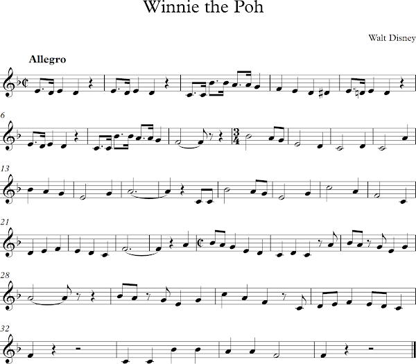Winnie the Poh. Partitura para flauta dulce. Melodía del film de Walt Disney. La podemos trabajar a partir de 6º de Primaria dependiendo del nivel de los alumnos.