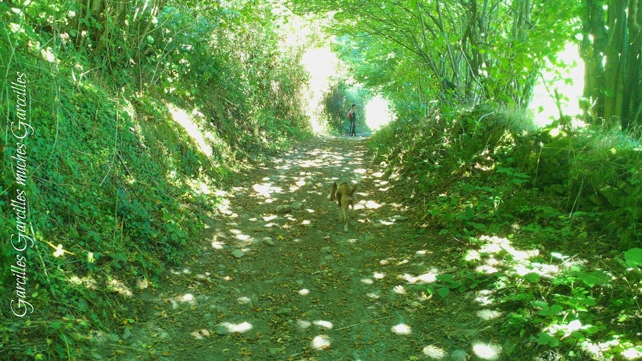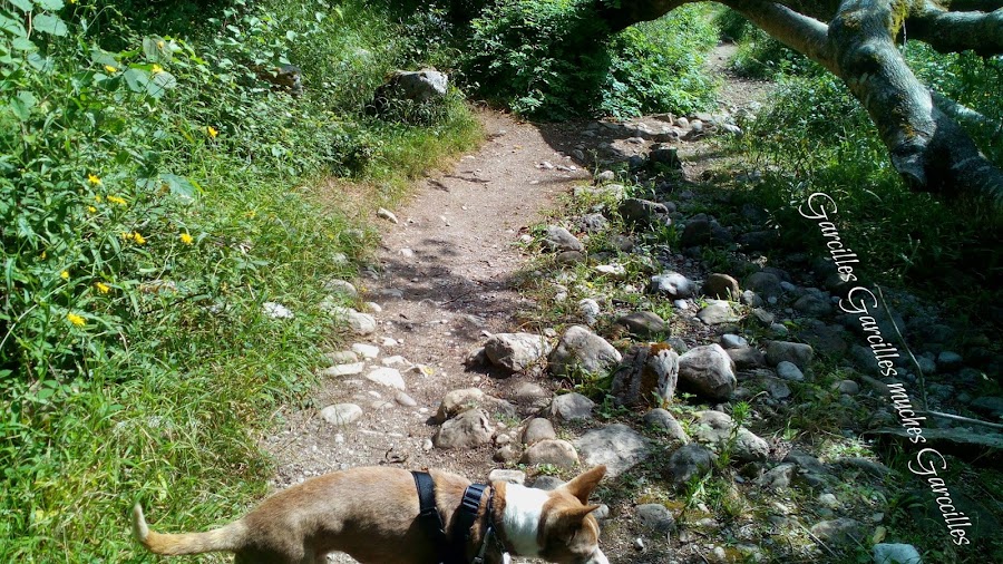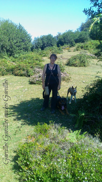 Aqui me veis con Golfo y Roco, "las chicas" estaban olisqueando por ahi, llevo a Golfo atado cuando vamos a pasar por sitios donde no le puedo ver y asi no le pierdo, el pobrecito está sordo, solo oye sonidos muy fuertes como los voladores, asi que por mucho que le llame....no me oye, conclusión, le ato y todos más tranquilos.